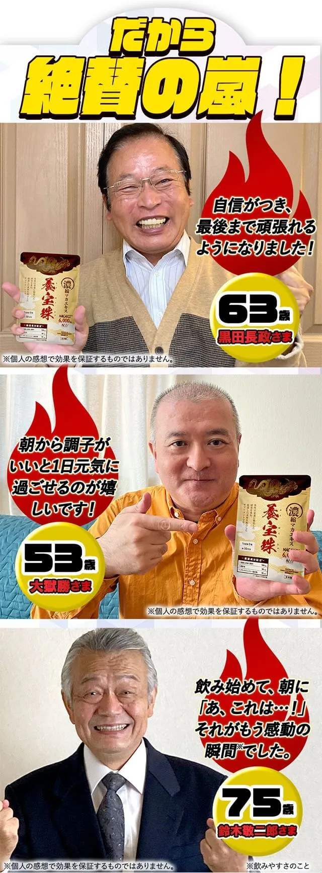 今までどんなに高額なものを使っても一向に効果が見られませんでした。しかし、養宝珠を飲むと夜のパワーがバリバリで、あの頃と大差無くなりました(笑)本当に感謝してます!